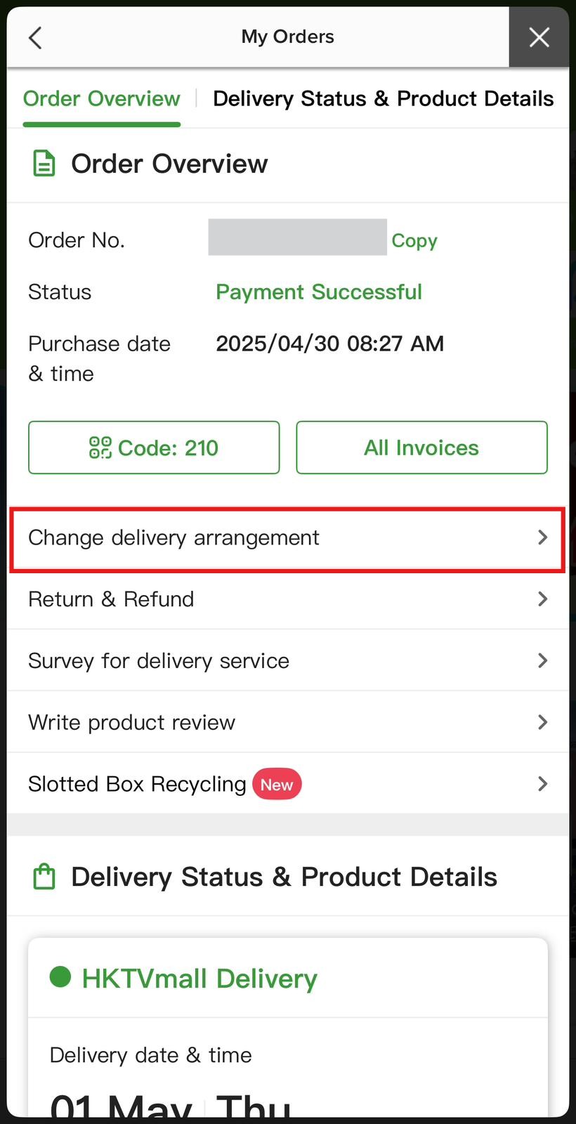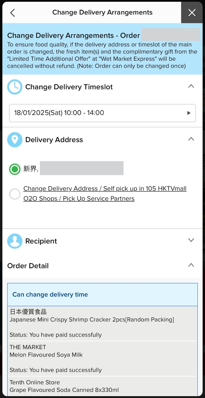 Customers can update the delivery arrangements (e.g. Change Delivery Timeslot / Delivery Address / Recipient) in "My Orders" > "Change Delivery Arrangements" before the product arrives at our warehouse.