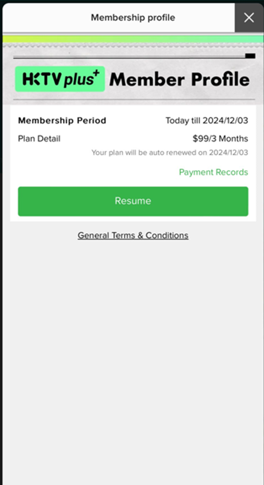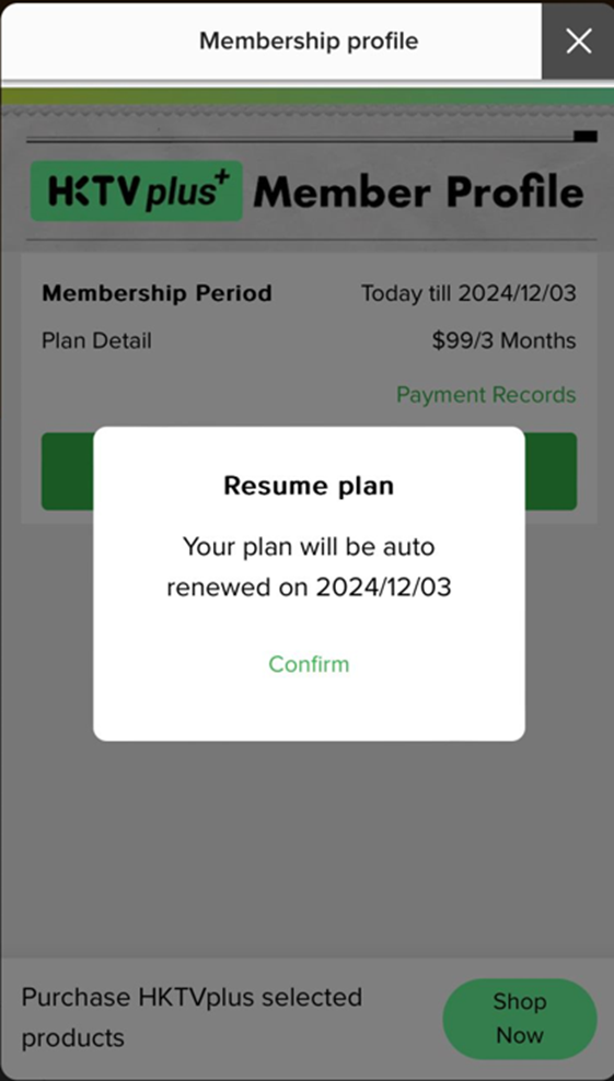 After cancel auto-renewal, customer can click “Resume” in the HKTVplus Membership Profile to resume their membership. Your HKTVplus membership will be auto renewal on the original end day of the plan.