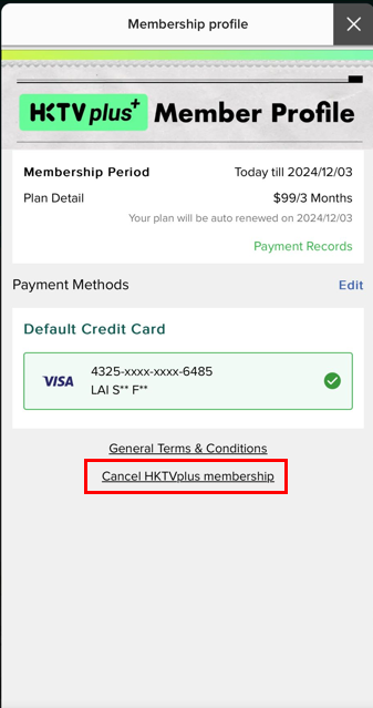 Unless you cancel the auto-renewal at least 24 hours before the end of your HKTVplus membership plan, you will be automatically subscribed to the HKTVplus membership plan. On the last day of your membership, the system will automatically charge the current membership fee from the credit card payment method you provided. If we are unable to deduct the amount automatically from the payment method you provided, you will need to re-enter your payment information and subscribe again.